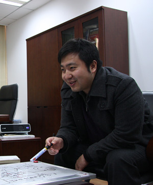 一个晴朗的冬日下午,在科技馆四楼的一间办公室里,一对年轻的师生正热火朝天地讨论着。学生托着腮帮认真思索,老师则面带微笑,一幅了然于胸的样子。俩人之间的一张写字板上,画满了复杂的线条和符号……这位年轻的老师正是我们此次采访的对象——省“钱江高级人才”特聘教授刘光宇,一位活跃在控制科学与其他学科的交叉领域里的青年科技工作者。
