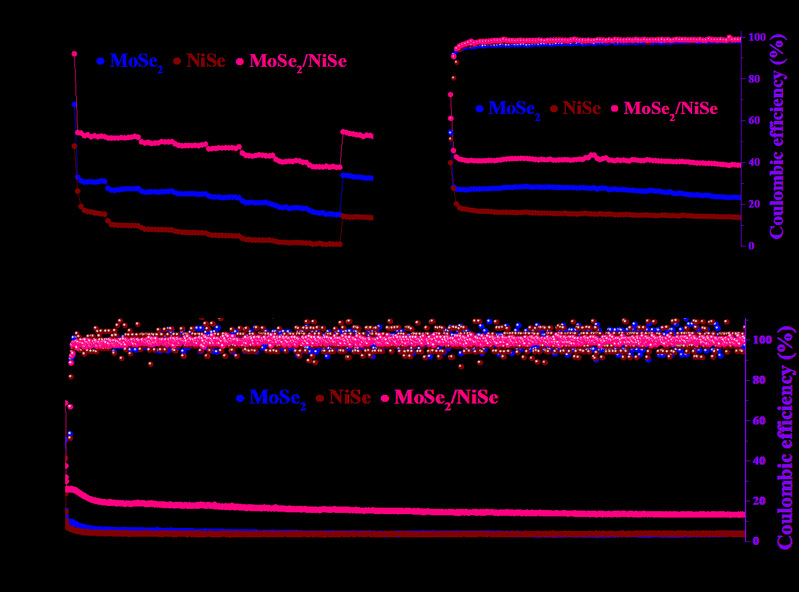 图2 MoSe2,NiSe和MoSe2/NiSe的(a)倍率性能(b)小电流循环性能和(c)大电流循环性能