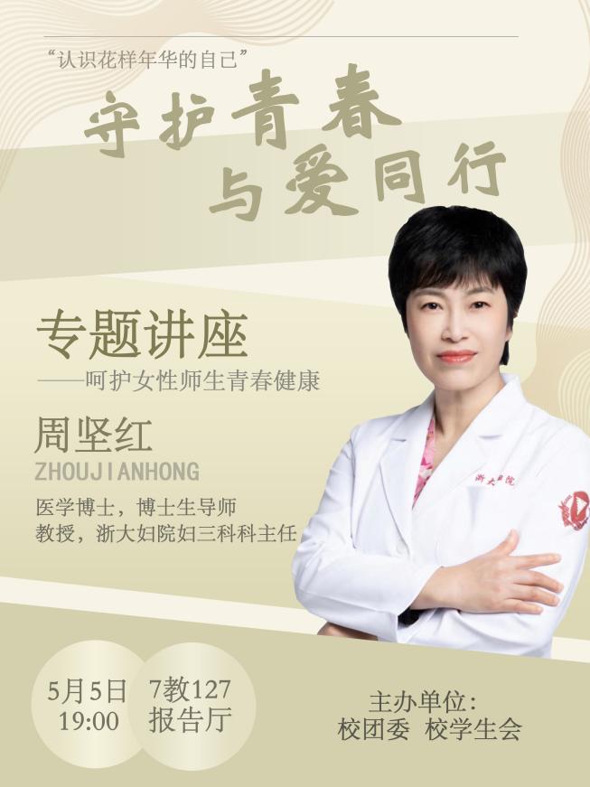 讲座介绍:为营造良好的校园青春健康氛围,普及女性师生青春健康知识,呵护女性师生生理和心理健康,增强自我保护意识,校团委、校学生会邀请浙江大学医学院附属妇产科医院妇三科周坚红主任,来我校开展“守护青春 与爱同行 呵护女性师生青春健康”科普讲座。本次讲座设置线下观看席位,欢迎广大师生在“青春杭电”第二课堂管理系统报名观看。