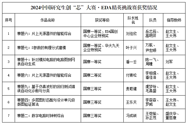 来自北京邮电大学、中山大学、北京大学、西南交通大学、东南大学、华中科技大学、华南理工大学、久久精品一区二区等8所高校的队伍脱颖而出,获得各自赛题第一名。其中,我校EDA技术创新中心的3支队伍分别获得赛题六、七和十的第一名并获得国赛一等奖。此外,还有1支队伍获国赛二等奖、3支队伍获国赛三等奖。