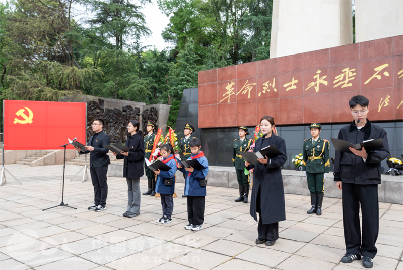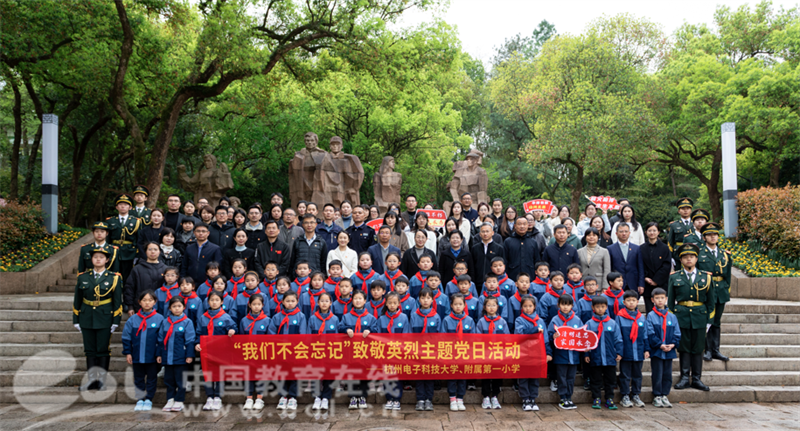 上午9时,在庄严肃穆的烈士纪念碑前,杭电师生党员佩戴金色党徽,共青团员佩戴团徽,少先队员佩戴鲜艳红领巾,三色交相辉映构成信仰光谱。校国旗护卫队护送国旗入场,全体人员高唱国歌并向烈士默哀。钱波副书记与附属一小董夫奏书记共同整理花篮缎带,师生代表敬献鲜花,深切缅怀革命先烈。